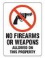 - Wording reads: "NO FIREARMS OR WEAPONS ALLOWED ON THIS PROPERTY (WITH GRAPHIC)".