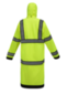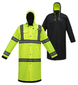 Zipper and fly front with snap closure. Double stitched and water proof tape. 2" wide reflective stripes. Features detachable hood, mic tab and badge holes. 3 pockets total: 1 chest phone pocket, 2 pass through access pockets. 49" long.