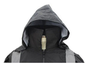 The High Visibility Raincoat With Reflective Stripes (Black) is made from 100% polyester 300 Oxford PU coated material. The raincoat comes with reflective stripes to enhance the raincoats high visibility. It is featured with a concealable hood, a snap front, 2 slash pockets, and a zipper front.